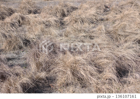 あれ草がぼうぼうに生えた公園と老朽化した遊具の写真素材