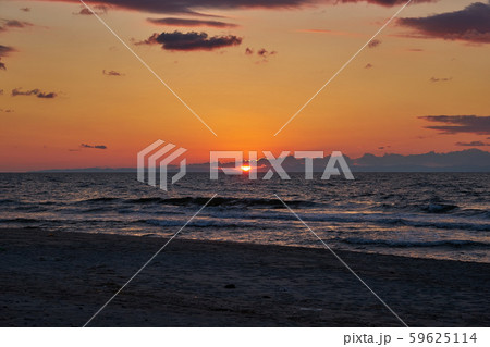 ビーチから眺める美しい夕日と富士山のシルエット。 日本国神奈川県三浦市、荒井浜海水浴場にて。 20
