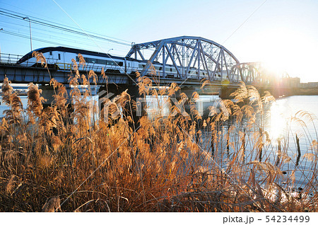 冬枯れのすすきと夕日を浴びて鉄橋を渡る京成スカイライナー