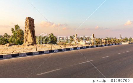 Road to the Valley of Kings and ancient Egyptian statues and tombs on the way, Luxor