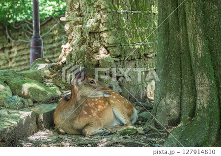 木陰にすわる子鹿 奈良公園荒池園地