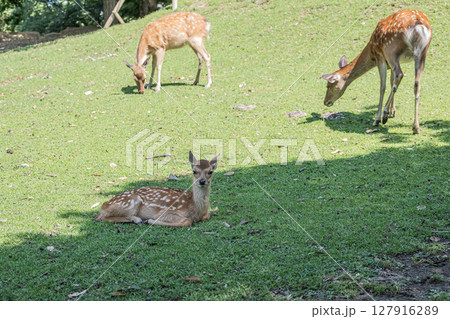木陰で草を食む奈良の鹿