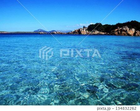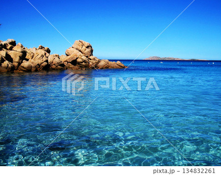 Beautiful panoramic sea view from Beach in Olbia, Sardinia, featuring crystal-clear turquoise water, smooth granite rocks, and soft white sand under a bright Mediterranean sky. This idyllic coastal
