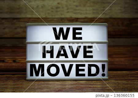 Lightbox with text "We Have Moved!" on wooden background