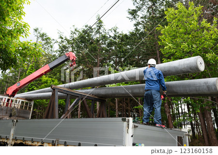 電柱の運搬荷下ろし作業 小型移動式クレーン