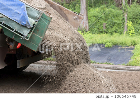 舗装工事イメージ トラックから路盤用の砂利を下ろす作業