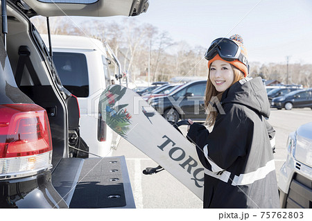 車のトランクからスノーボードを出す若い女性 ウィンタースポーツ