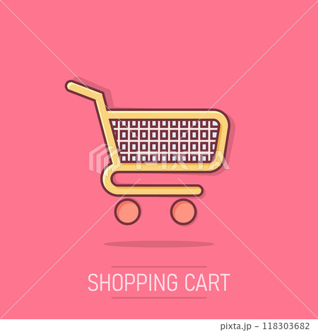 Shopping cart icon in comic style. Trolley cartoon vector illustration on isolated background. Basket splash effect business concept.