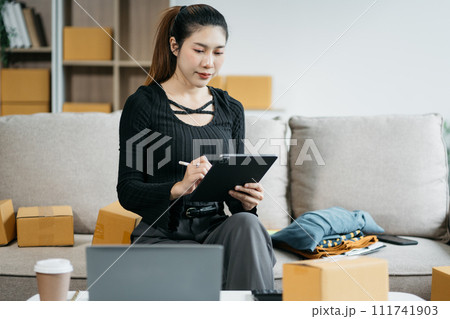 Concept of selling products online.entrepreneur or freelance checking orders from customers, woman runs an e-commerce business on websites and social media.