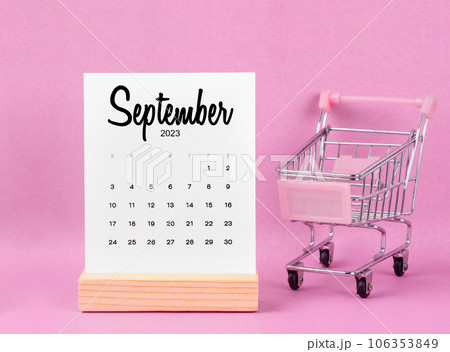 The September 2023 Monthly calendar with shopping cart against pink background.
