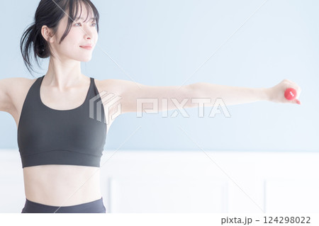 ウェイトを持ってトレーニングをする若い女性 白バック