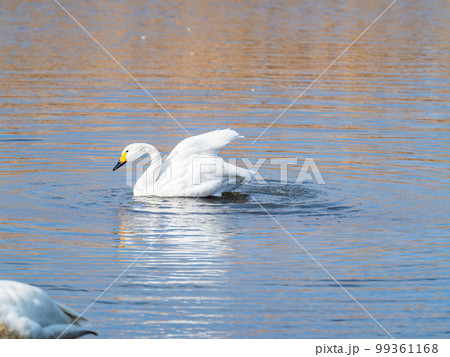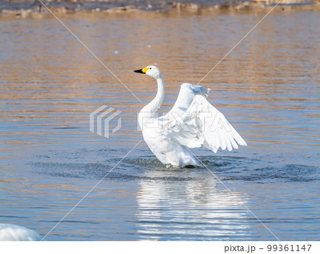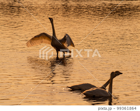 白鳥の越冬地 夕暮れの茨城県菅生沼の優雅で躍動的な白鳥のシルエット 羽ばたき