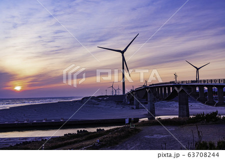 (静岡県)菊川河口潮騒橋 浜辺の風車 夜明け