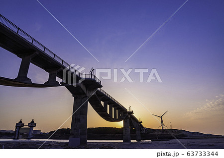 (静岡県)菊川河口の潮騒橋と風車 夕景