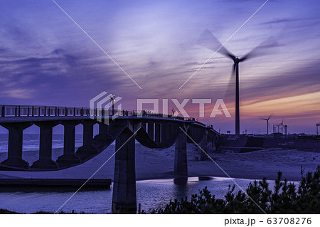 (静岡県)菊川河口の潮騒橋・浜辺の風車 夜明け