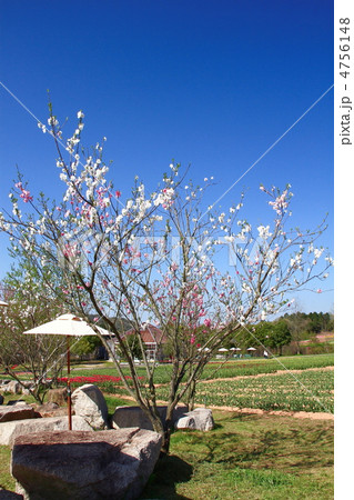 福岡県直方市の桃の花咲く多賀神社境内の赤い傘と緋毛氈の椅子