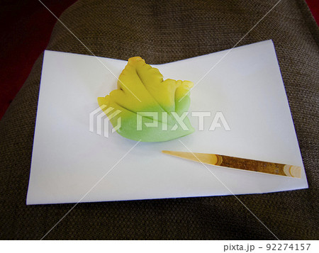 鮮やかで上品な味の楓の和菓子を懐紙の上で。
