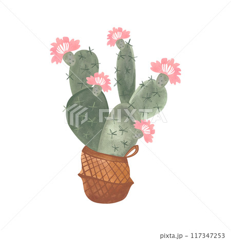 Cactus in a wicker basket. Plants for the home. Floriculture. Interior decoration. Isolated watercolor illustration on white background. Clipart.
