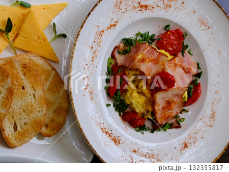 Homemade breakfast with scrambled eggs, boiled buckwheat and greens