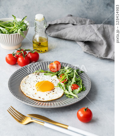 Fried eggs with arugula and cherry tomatoes on a dark plate on a blue txtured background
