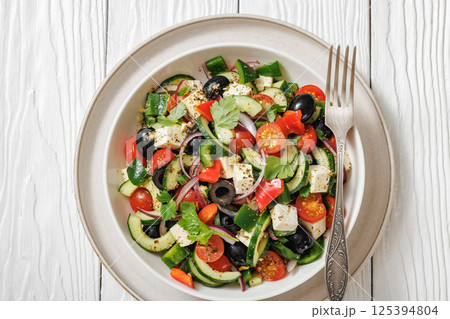 Vegetable salad with lettuce, tomatoes, croutons and olives in a bowl on a light background