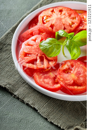 Salad Plate with Ripe Tomato Slices and Fresh Basil on Green Napkin, Close-Up