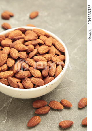 Almonds in bowl on grey background. Whole and dried nuts. Vertical photo