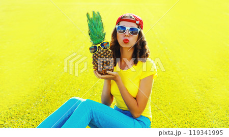 Summer portrait happy young woman blowing kiss with pineapple, glasses on the grass in summer park