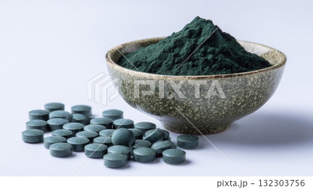 Spirulina superfood powder in ceramic bowl with tablets on white background, nutrient-dense blue-green algae supplement for health and wellness with natural organic ingredients