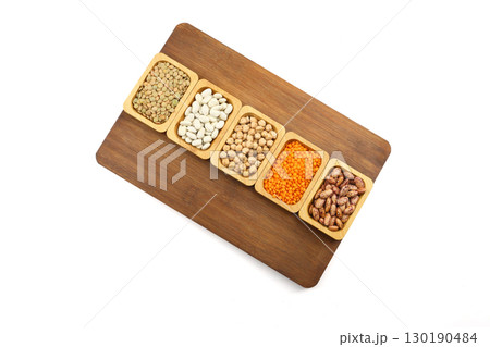 Different type of raw dry legumes composition. lentils, red lentils, chickpeas and kidney beans. Mix organic legume concept.