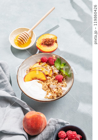 Flat lay of natural yogurt with oat granola or muesli, peach, raspberry and honey in a bowl