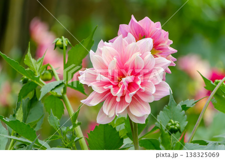 庭園に咲き誇るピンクと白のグラデーションのダリア