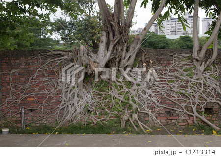 台湾 台北にある華山1914文創園区 壁を突き破る生命力にある木