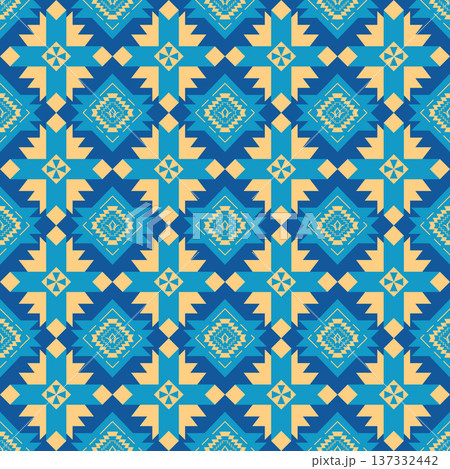 Geometric Ethnic Seamless Pattern, Blue and Yellow Tribal Fabric Textile Ornament