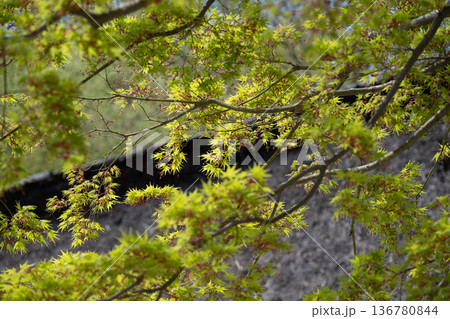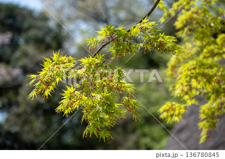 春の陽に輝く萌葱色のモミジの葉