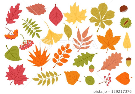 Cartoon autumn leaves. Fallen colored foliage, wilting plants, different trees organic elements, maple, orange ginkgo, yellow oak, green chestnut, season forest splendid vector isolated set