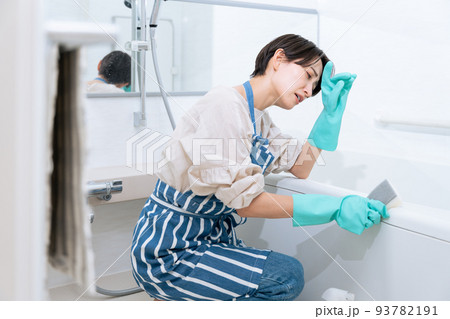 風呂掃除するミドル女性(家事・家事代行・清掃業者・疲労・ストレス)