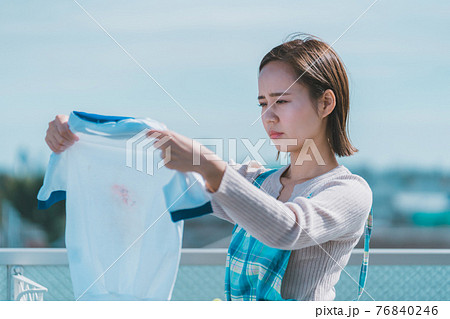 洗濯物のシャツの襟元の汚れに悩む主婦の女性(黄ばみ・漂白剤・洗剤・汗ジミ・汚れ)