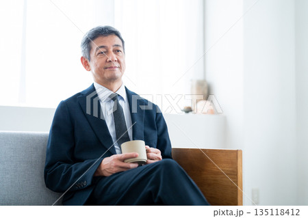 ホテルのソファでコーヒーを飲みながら寛ぐビジネスマン