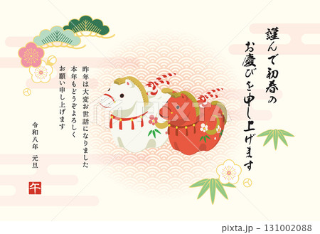 かわいい馬の土鈴、午年の年賀状テンプレート(添え書きあり)