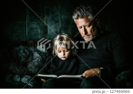 Father and child reading together on a cozy couch surrounded by soft textures and warm lighting