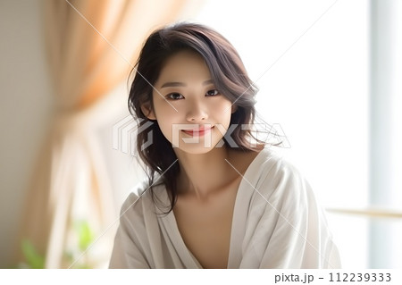 serene portrait of woman with natural makeup, soft lighting, and cozy atmosphere. Her expression conveys calmness and beauty