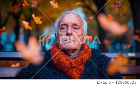 Elderly man sitting on a park bench surrounded by falling autumn leaves, reflecting a sense of nostalgia and tranquility in a serene outdoor setting.