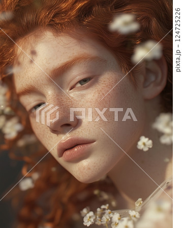 Captivating portrait of a young person with red hair surrounded by delicate flowers