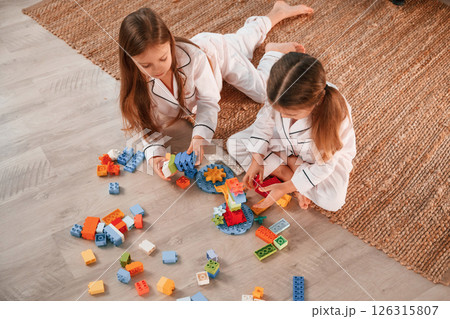 View from the top. Playing construction game. Two little girls are having fun together in domestic room