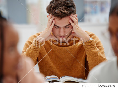 Study, stress and student at university with anxiety for a test. Young man with headache, worried and studying with textbook on desk in library. Tired in education, learning and stressed about exam