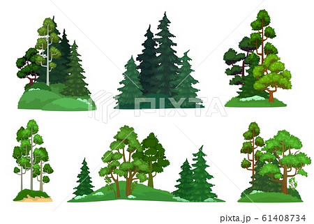 Forest trees. Green fir tree, forests pine composition and isolated trees cartoon vector illustration set