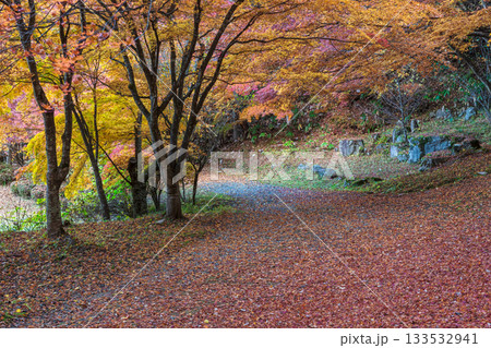 紅葉した林の中の木道