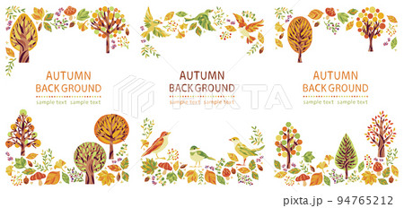 秋の紅葉の木々と小鳥のイラストフレームセット 縦