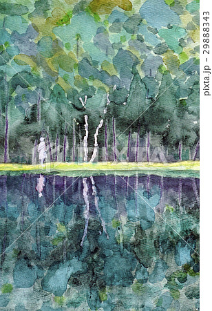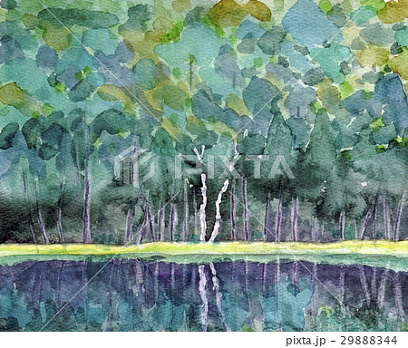 紅葉した森と川の水彩画風のイラスト